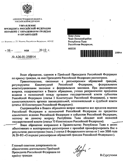 Из Москвы мне дали ответ, что ваше заявление направлено в прокуратуру Республики Тыва, но оттуда никакого ответа я так и не получил.