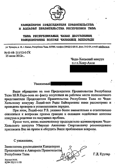 В этом году в мае я снова написал президенту Путину. Из Москвы мне пришел ответ (высылаю копию) «Ваше обращение направлено в правительство Республики Тыва для рассмотрения с просьбой проинформировать вас о результатах рассмотрения». Но никакого ответа от них я так и не получил. А вот только 18 июня 2012 г. приехал представитель из правительства, и с местными чиновниками пришли ко мне. Представитель говорит, вы просили у Путина В.В., чтобы он оказал помощь по выезду за пределы Республики Тыва. Я говорю, да просил. И предложили мне сумму где-то около 700 тысяч рублей и спросили, будете брать эту сумму, я говорю: буду. Но при этом я их попросил, добавьте к этому еще немного, а то на эти деньги за пределы Республики квартиру не купить. Они согласились. Все обговорили, я сдал им копии документов. Они говорят, подыскивай себе за пределами республики квартиру, а в которой ты сейчас живешь, мы заберем. Я говорю, забирайте, только дайте мне средства на покупку квартиры за пределами РТ. Они говорят, дадим, только, мол, быстро это не делается, ждать придется 2-3 месяца. Я поверил и стал ждать.