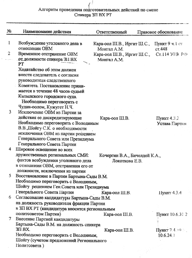1. Возбуждение уголовного дела в отношении ОВМ (Оюн Василий Майлолович – ред.). Ответственные – Кара-оол Ш.В., Иргит Ш.С., Монгал А.М.