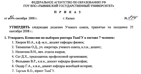 Замечено: если кто-то сознательно нарушает закон, то делает это не по доброй воле или не бескорыстно. Судя по всему, и тут мы сталкиваемся с подобным случаем. Судите сами, 26 октября 2008 года приказом по университету была утверждена комиссия по выборам ректора ТывГУ в составе 7 человек. В нее вошли Ю.Хворов, О.Тапышпан, В.Никитина, Д.Сат, В.Фельдман, Г.Ондар и В.Тарган. 18 ноября прошли выборы, и 19 ноября документы по итогам выборов должны были быть отправлены в Москву.