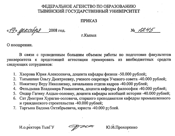 Но этого почему-то не случилось, хотя члены комиссии – люди грамотные и даже, может быть, порядочные. Не исключено, что исполнить свой долг им помешал приказ Прохоренко от 19 декабря за №1245 «О поощрении», на основании которого он премировал «В связи с проведением большого объема работы по подготовке университета к аттестации» Хворова на 50 тыс. руб., а Тапышпан, Никитину, Сат, Фельдмана, Ондар и В.Таргана – по 40 тыс. руб.