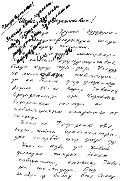 Думается, скорее второе. Надеемся, в рамках расследования уголовного дела о государственной измене органами ФСБ и прокуратуры будет дана правовая оценка этому во всех отношениях примечательному письмецу, оригиналом которого мы располагаем. Подлинность его не вызывает никаких сомнений и наверняка будет подтверждена соответствующей почерковедческой экспертизой.