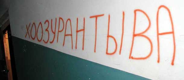 Эту надпись наш корреспондент увидел на стене одного кызылского подъезда. Можно, конечно, поворчать о хулиганах, не жалеющих труда маляров... Но давайте задумаемся: почему «вольные художники подъездов» не нанесли название какой-нибудь группы, исполнителя, или другой, зачастую дурацкой надписи? Почему написали: «Хоозураан Тыва» («Разрушенная Тува»)? И эта надпись – не единственная и не первая...