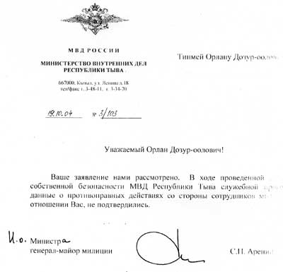 Анонимный и.о. министра Внутренних Дел Тувы с размашистой круглой подписью сообщает: «Ваше заявление нами рассмотрено. В ходе проведенной службой собственной безопасности МВД РТ служебной проверки данные о противоправных действиях со стороны сотрудников министерства... не подтвердились». Похоже, похождения пьяного замминистра в рабочее время по государственным учреждениям с выколачиванием водки, угрозами, организацией пьяных дебошей в питейных заведениях с последующим похищением невинных людей уже считаются нормой в нашем МВД.