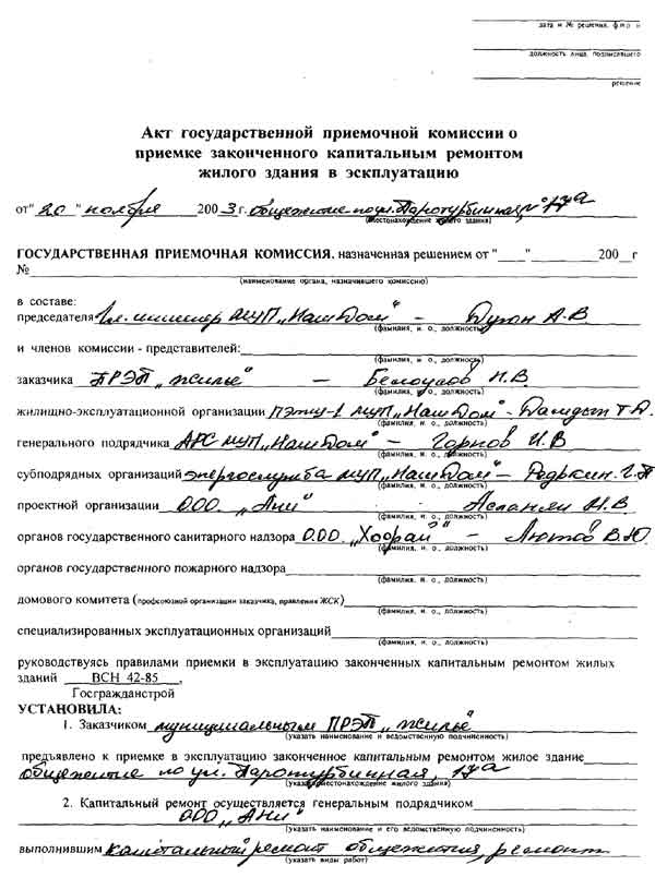Из акта приемки следует, что 20 ноября 2003 года Госкомиссия под председательством гл.инженера МУП «Наш Дом» Дуюна А.В. приняла капитальный ремонт общежития и инженерных сетей, признав качество работы «удовлетворительным» с оценкой качества жилья на «хорошо». Но назвать документом эти три страницы бумаги язык не поворачивается: в роли заказчика, эксплуатационной организации и генподрядчика числятся сразу три представителя МУП «Наш дом» – Белоусов, Дамдын и Горнов, проектной организации – строительное ООО «АНИ» в лице Асланяна, а орган санитарного надзора представлен ООО «Хорай» в лице Лютого. Этакий междусобойчик. Собрались друзья-соратники, подписали и закусили. Но самое главное – в акте нет подписи представителя госпожнадзора.
