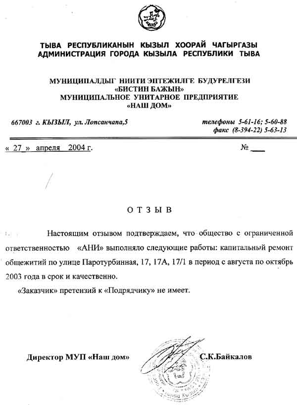 Отзыв о качестве проведенного ремонта, подписанного директором МУП «На дом» Байкаловым.