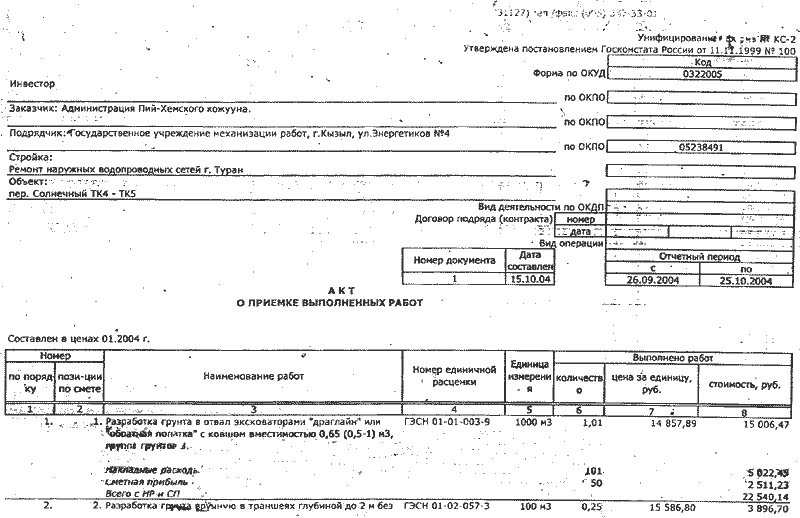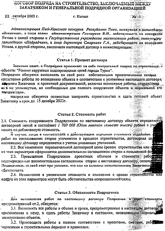 Мы осознаем, что В.Гончаров не новичок по части финансовых афер. Знаем также, что кожуунный прокурор в Пий-Хеме «ручной», и вместе они запросто могут попробовать «похерить» документы, проливающие свет на гончаровские махинации. И потому публикуем Акт о приемке выполненных работ на сумму 570 тыс. рублей от 15.10.04 г., подписанный Гончаровым и гл. инженером ГУМР С.Есиповым и договор №1 от 22 октября 2003 года на сумму в 1700 тысяч рублей.