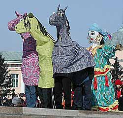 В столице республики народное гуляние прошло на Площади Арата. Представители кызылского Комитета по культуре, одетые в красочные русские национальные костюмы, весело и задорно открыли праздничные мероприятия.