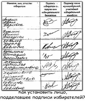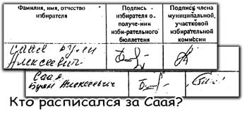 Да, действительно, пока нельзя утверждать, что фальсификацию своих выборов устроил сам кандидат. Это может выяснить только следствие и, скорее всего, он выступал в роли заказчика. Но непосредственных исполнителей Буликяну и Ведягину установить при наличии желания было совсем несложно. Даже не прибегая к поголовной проверке списков досрочного голосования очевидно, что подписи Э.П. и Л.П. Ковалевых, М.К.Андрияс, Е.Г. Кузьмина, Н.В. и Т.В. Мязиных, по две И.В. Вахрушевой и Б.А. Саая подделаны членами МИК, обладающими подписями. Остается только установить, кому из девяти членов МИКа эти подписи принадлежат. И привлечь их к уголовной ответственности по ст.ст. 141, 142, 285, 286, 292, 293 УК РФ.