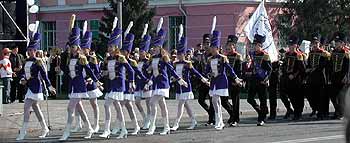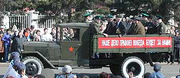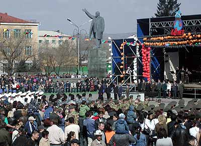 На этот раз главное действо праздника был перенесено на Площадь Арата. Здесь установлена украшенная сцена. Слева и справа от неё усадили ветеранов. Неподалеку расположилась немногочисленная монгольская делегация, а рядом почему-то развевался флаг Киргизии. На площади возле Муздрамтеатра публики столько, сколько не собиралось даже в советские времена. Чтобы получше разглядеть разворачивающее действо, зрители стояли на ступеньках театра, а ребятня спорила за право взобраться на фонарные столбы.