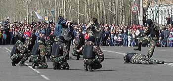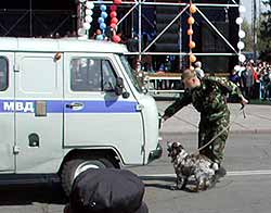 Затем начались показательные выступления. К сожалению, проходили они близко к зрителям, и увидеть их могли только те, кто стоял рядом. Первыми под хард-музыку выступили ОМОНовцы с демонстрацией приемов рукопашного боя. Потом кинолог со своим другом-собакой находили в машине пакетики с запрещенными веществами. Следующий номер – задержание нарушителя – вызвал наибольший интерес зрителей: когда «нарушитель» «напал» на офицера, овчарка в ярости буквально порвала в клочья... защитный костюм «нарушителя». Восторгу ребятни не было предела.