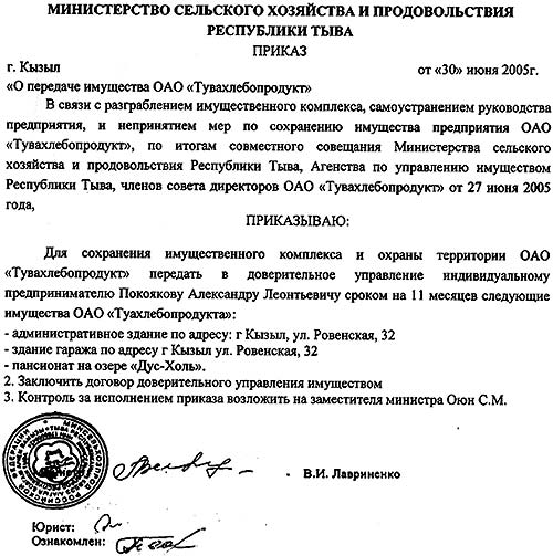 Нет, неправда. ОАО «Тувахлебопродукт» действительно находится в тяжелом финансовом положении благодаря позиции правительства Тувы. Но процедура банкротства предприятия пока не запущена. Тем не менее слухи о том, что новым хозяином имущества стал некто Покояков, не лишены оснований. Дело в том, что министр сельского хозяйства В.Лавриненко 30 июня 2005г. издал приказ, коим передал в доверительное управление индивидуальному предпринимателю Александру Покоякову сроком на 11 месяцев имущество ОАО «Тувахлебопродукта»: