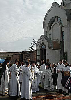 Колонна верующих и в сопровождении нашей доблестной милиции дошла до строящегося Храма. Верующий народ собрался вокруг входа в Часовню Иверской иконы Божьей Матери, которую предстояло торжественно освятить. В честь знаменательного события, которое счастливым образом совпало с 10-летним юбилеем Епархии, впервые в Туву прибыла такая представительная делегация церковных иеархов. Вместе с епископом Абаканским и Кызылским Ионофаном прибыл и владыка Тобольский и Тюменский, ректор Сибирской духовной семинарии отец Дмитрий и другие епископы Сибирских епархий.