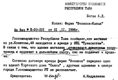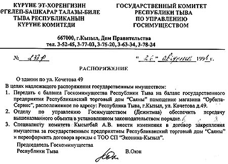 Но это не помешало Госкомимуществу РТ 13 марта 2001 года в газете «Тувинская правда» объявить аукцион о продаже ГУП «Республиканский торговый дом «Саяны» – магазин «Орбита-Сервис», расположенный по адресу г.Кызыл, ул.Кочетова 49. Называлось всё это «отдельно стоящим зданием с первоначальной оценкой в 260 тыс. рублей».