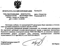 Когда под давлением коллектива СУ при МВД РТ по материалам проверки всё же возбудило уголовное дело 2-474/02, и расследование велось ни шатко ни валко, рабочие обратились по этому поводу в прокуратуру, указывая, что МВД РТ является одним из расхитителей завода, и потому они не доверяют милицейским следователям. На что старший прокурор СУ прокуратуры В.Чернов РТ 20.11.02 невозмутимо ответил: «Выделение руководством Кызылского пивзавода спонсорской помощи УБЭП КМ МВД РТ не относится к предмету расследования данного уголовного дела, поскольку предварительное следствие осуществляется СЧ СУ при МВД РТ, а не УБЭП КМ МВД РТ».