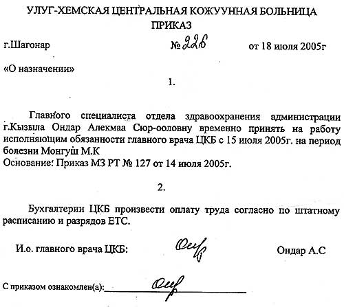 Краткая предыстория: После окончания Новокузнецкой ординатуры главным врачом Улуг-Хемской ЦКБ в сентябре 2002 года был назначен Мерген Монгуш. И работал он в этой должности до ноября того же года. А в ноябре приказом Минздрава М.Монгуш был освобожден от занимаемой должности и на его место была назначена главврачом Улуг-Хемской ЦКБ специалист Минздрава Алекмаа Ондар.