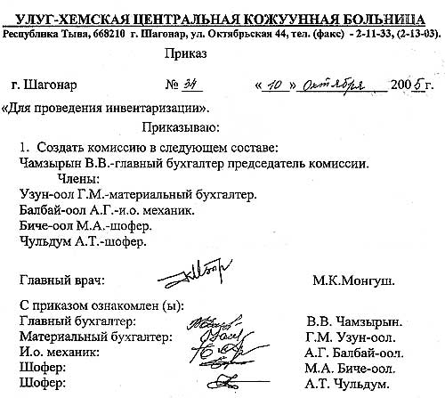 Проведенная в октябре 2005г. ревизия установила, что одну автомашину новая начальница обменяла на мясо стоимостью 21 тыс. рублей, а следов второго УАЗа в бухгалтерии больницы не обнаружили. Главврач подал соответствующее заявление в Улуг-Хемскую прокуратуру, и к делу о пропаже автомашины подключились сыщики кожуунного отдела по борьбе с экономическими преступлениями.