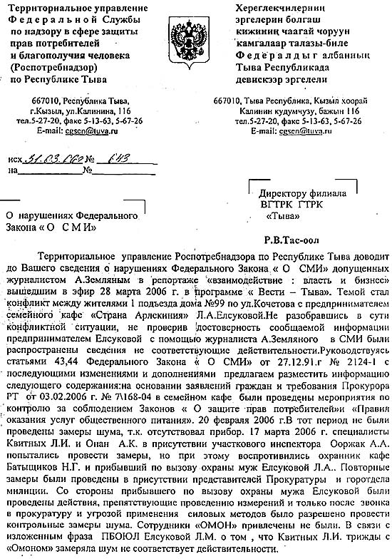 Важное место в сюжете отводилось выступлению гл. специалиста Территориального управления Роспотребнадзора по Республике Тыва Квитных Л.И. По замыслу А.Земляного, после ее выступления у телезрителей должно было создаться впечатление, что с уровнем шума от кафе все в порядке. Этого он постарался добиться, более чем наполовину обрезав ее выступление. Кто дал право так самовольничать А. Земляному в отношении представителя федеральной структуры? По факту выдергивания А.Земляным одной фразы из контекста выступления, что привело к искажению информации, Территориальное управление Роспотребнадзора по Республике Тыва направило письмо «О нарушениях Федерального Закона «О средствах массовой информации» на имя директора ГТРК «Тыва» Тас-оола Р.В.