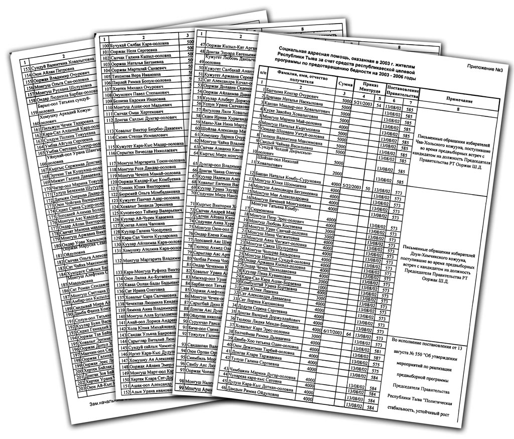 А что касается всенародности выбора Ооржака на высокий пост, так эта же проверка выявила незаконное выделение денег избирателям Тувы в обмен на поддержку Ш.Ооржака на выборах 2002 года. Как выяснили контролеры, в ходе выборной кампании Ш.Ооржак за свою поддержку пообещал избирателям деньги и 13.08.02 г. своими Постановлениями №№ 572, 573, 575, 584, 585, 588 и 589 обещанные суммы были правительством незаконно, по мнению проверяющих, выделены и выплачены избирателям. Причем в обоснование этого чиновники прямо указали: «Письменные обращения избирателей, поступившие во время предвыборных встреч с кандидатом на должность Председателя Правительства РТ Ш.Д.Ооржака». А мы удивлялись: как при таком имидже Ооржаку удалось в третий раз переизбраться. По нашему мнению, должность была тривиально куплена.