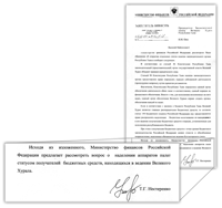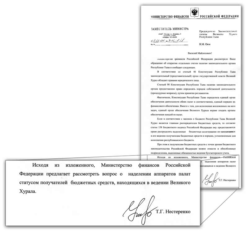 Чтобы читателю все стало ясно, достаточно привести фрагменты лишь двух документов. Первый датирован 29 марта 2004 года – это письмо заместителя министра финансов РФ Т.Г.Нестеренко, который предлагает спикеру ЗП ВХ РТ В.Оюну «рассмотреть вопрос наделения аппаратов палат статусом получателей бюджетных средств, находящихся в ведении Великого Хурала».