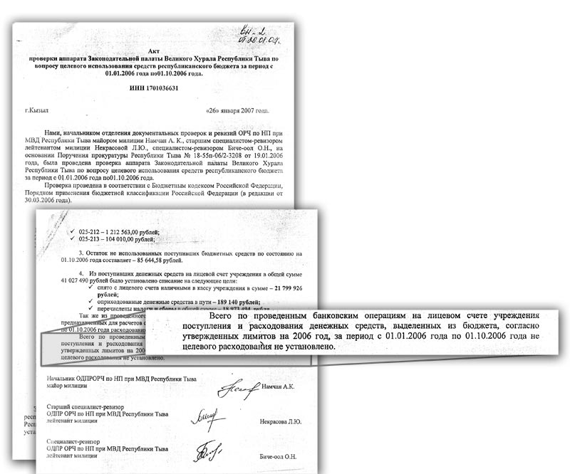А второй датирован 26 января 2007 года. Это – акт проверки финансовой деятельности аппарата ЗП ВХ РТ, в котором начальник отделения документальных проверок и ревизий МВД РТ майор милиции А.К.Намчан вкупе с другими проверяющими пришли к неприятному для Ш.Ооржака выводу, что в деятельности аппарата Законодательной палаты «за период с 1.01.06г. по 1.10.06г. не целевого расходования не установлено».