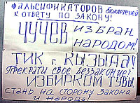 Более того, ТИК Кызыла, вопреки решению Верховного Суда России о признании итогов выборов 8 октября по Восточному округу Кызыла, признании победившим Ивана Васильевича Чучева, пошла на беспрецедентный подлог и фальсификацию избирательных бюллетеней, признав победившим по Восточному округу проигравшего выборы С. Монгуша.