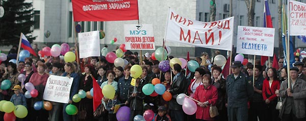 «Человеку труда – достойную зарплату!», «Нам нужны достойные пенсии, а не пособия по бедности!», «За уважение к человеку!» – под этими лозунгами 1 мая по улице Ленина к памятнику вождю пролетариата прошли в единой колонне коммунисты, патриоты, справо– и единоросы, а также примкнувшие к ним сотрудники аппарата правительства республики и продажная профсоюзная аристократия.
