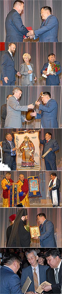В зале уже находились приглашенные, среди которых были члены тувинского правительства, депутаты парламента, ветераны, воины-афганцы, представители политических партий и общественных движений, руководители кожуунов и городов республики. Приметны были почетные гости республики: сенаторы С.Пугачев и Л.Нарусова, руководители из Красноярского края, Республик Бурятия, Хакасия и Алтай, Баян-Ульгийского, Убса-Нурского, Завханского аймаков и сумона Ценгел Монголии.
